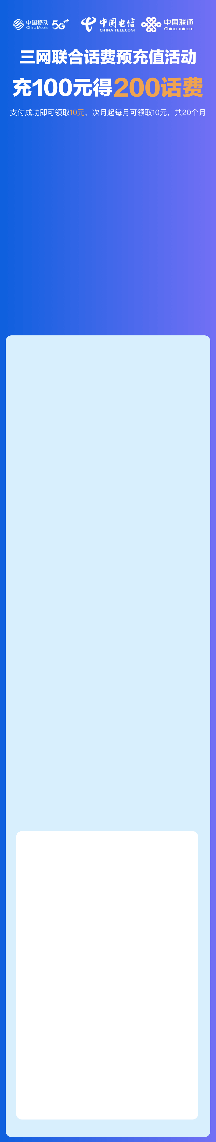 2.1 支付 100 元参与话费月月领活动,可获得200元电话资费,在网站https://hf-lqhf.hlzxgx.com中点击【领取话费】,每月可以手动领取10元话费,当月不领则当月话费权益作废。